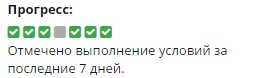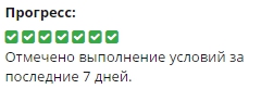 По мере выполнения условий достижения квадратики в блоке "прогресс" будут закрашиваться зелёным цветом. Если все они будут закрашены непрерывно (7 дней подряд), вы получите достижение. Если между закрашенными квадратами будет один серый, значит, в один из дней вы не выполнили условия и награды не получите.
